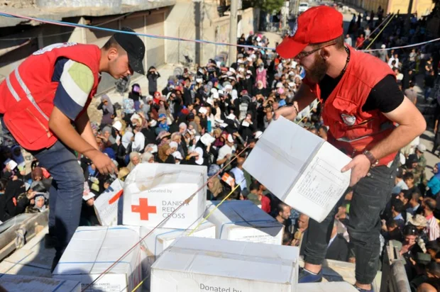 Members of Syrian Red Crescent distribute humanitarian aid parcels in city of Deir Ezzor on Saturday after IS siege was broken (AFP)