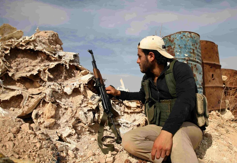 A Syrian rebel fighter sits on a hill overlooking regime-held areas in northwestern countryside of Aleppo province. (AFP)