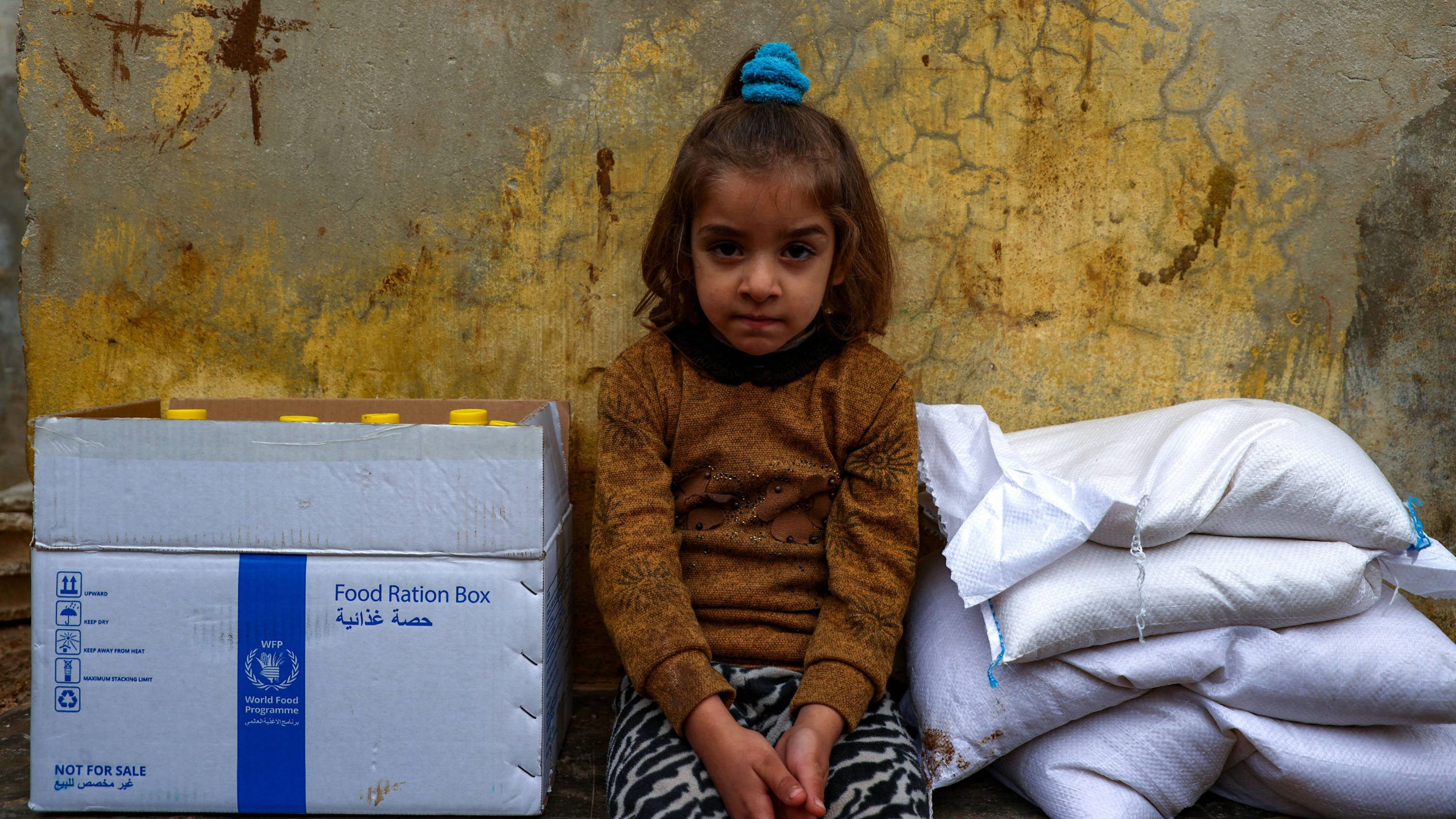 A displaced Syrian girl sits amid relief packages from the United Nations' World Food Program (WFP) before the cessation of aid delivery, in the camp of Atme, on the outskirts of Idlib, northwestern Syria, on 6 December 2023 (AFP)