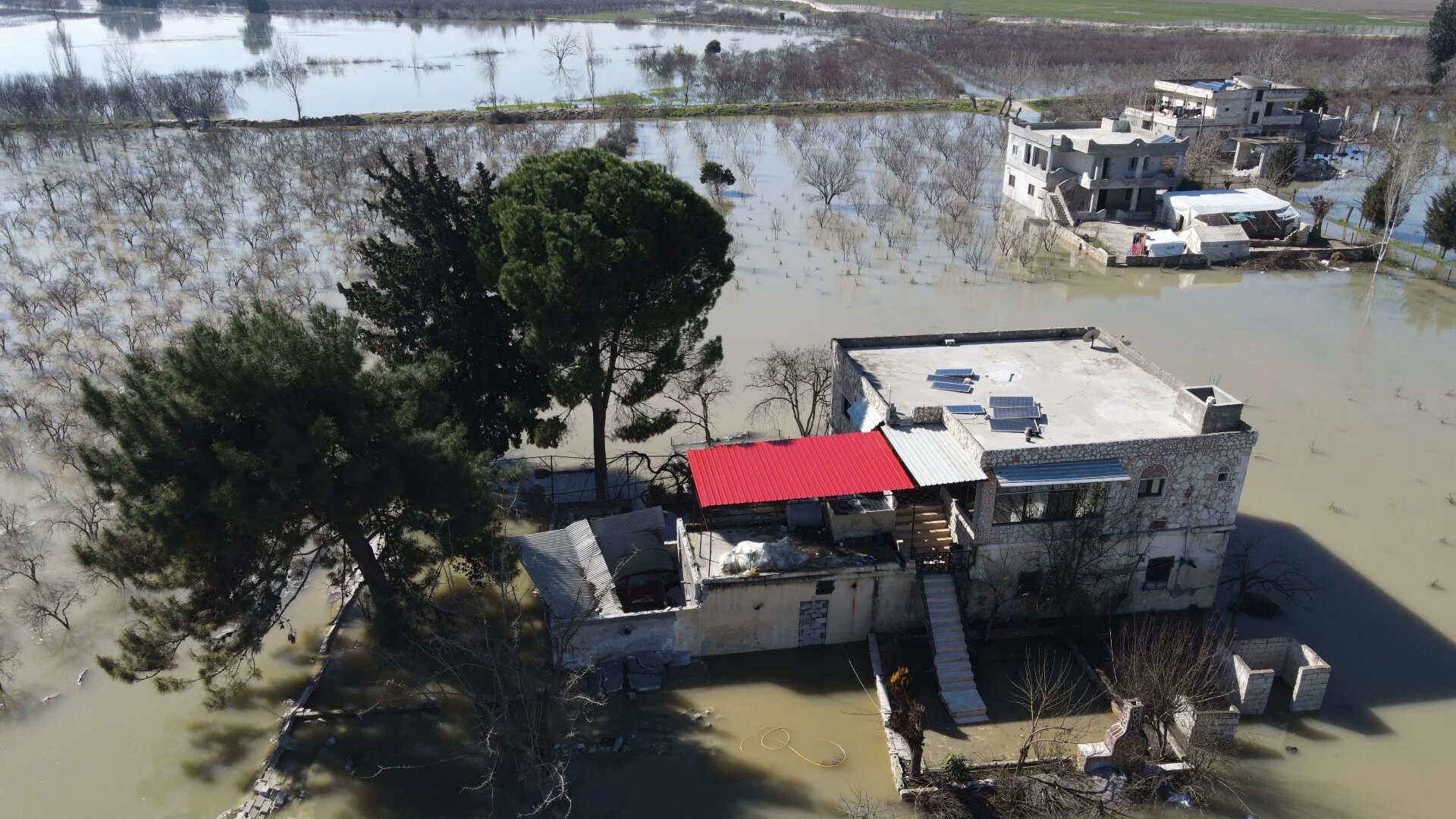 An aerial view shows flooding in the rebel-held Syrian village of Al-Taloul, near the Turkish border on 10 February 2023, after a dam collapsed in the aftermath of the deadly earthquake that struck Turkey and Syria (MEE/Yousef Gharaibi)