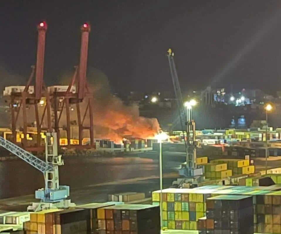 Photos and footage posted by Sana showed flames and smoke in the container area and a fire truck at the scene.