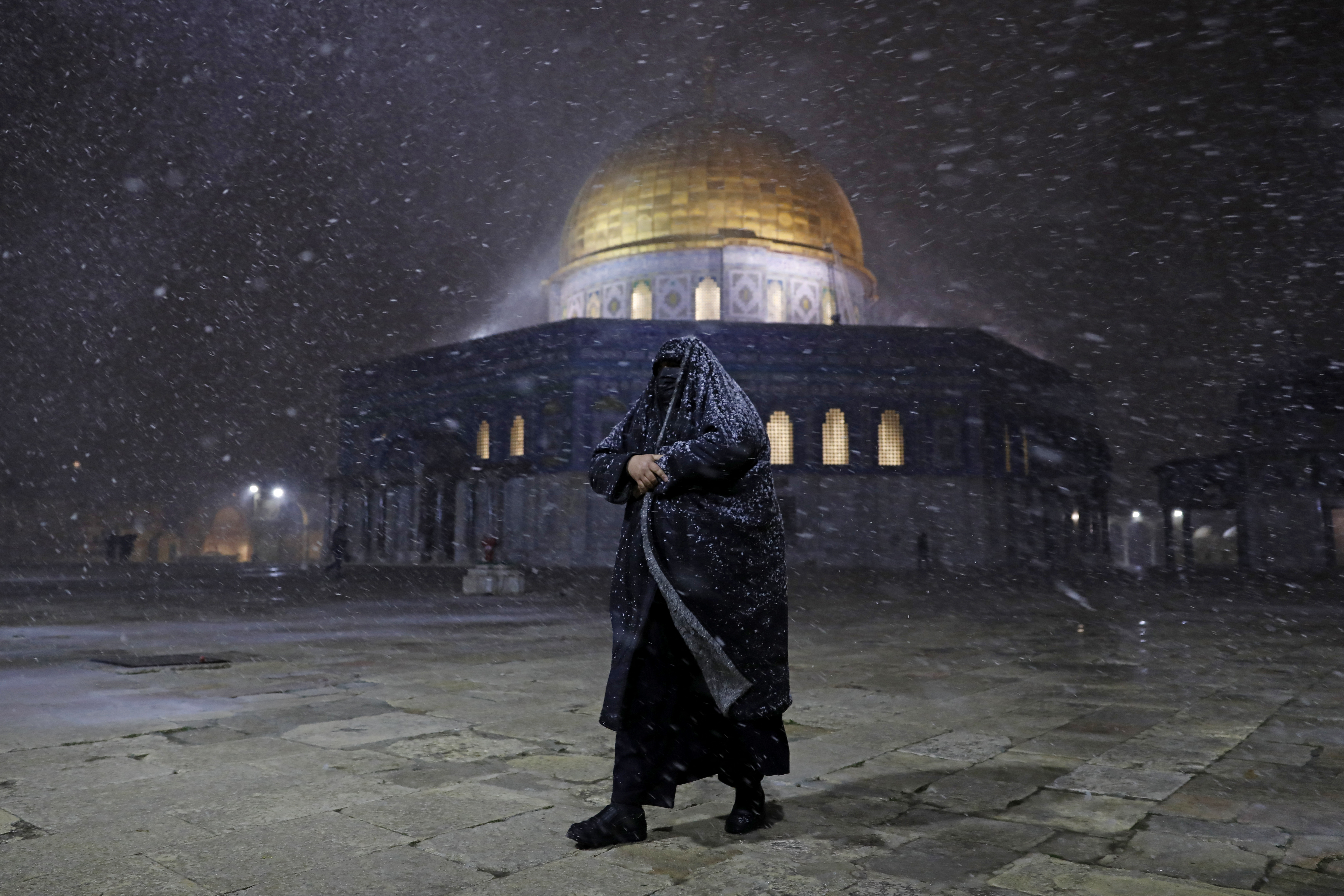 The Al-Aqsa Mosque compound in Jerusalem was covered in a light dusting of snow on Thursday. In the surrounding areas, many people went for walks and built snowmen. (AFP/Emmanuel Dunand)