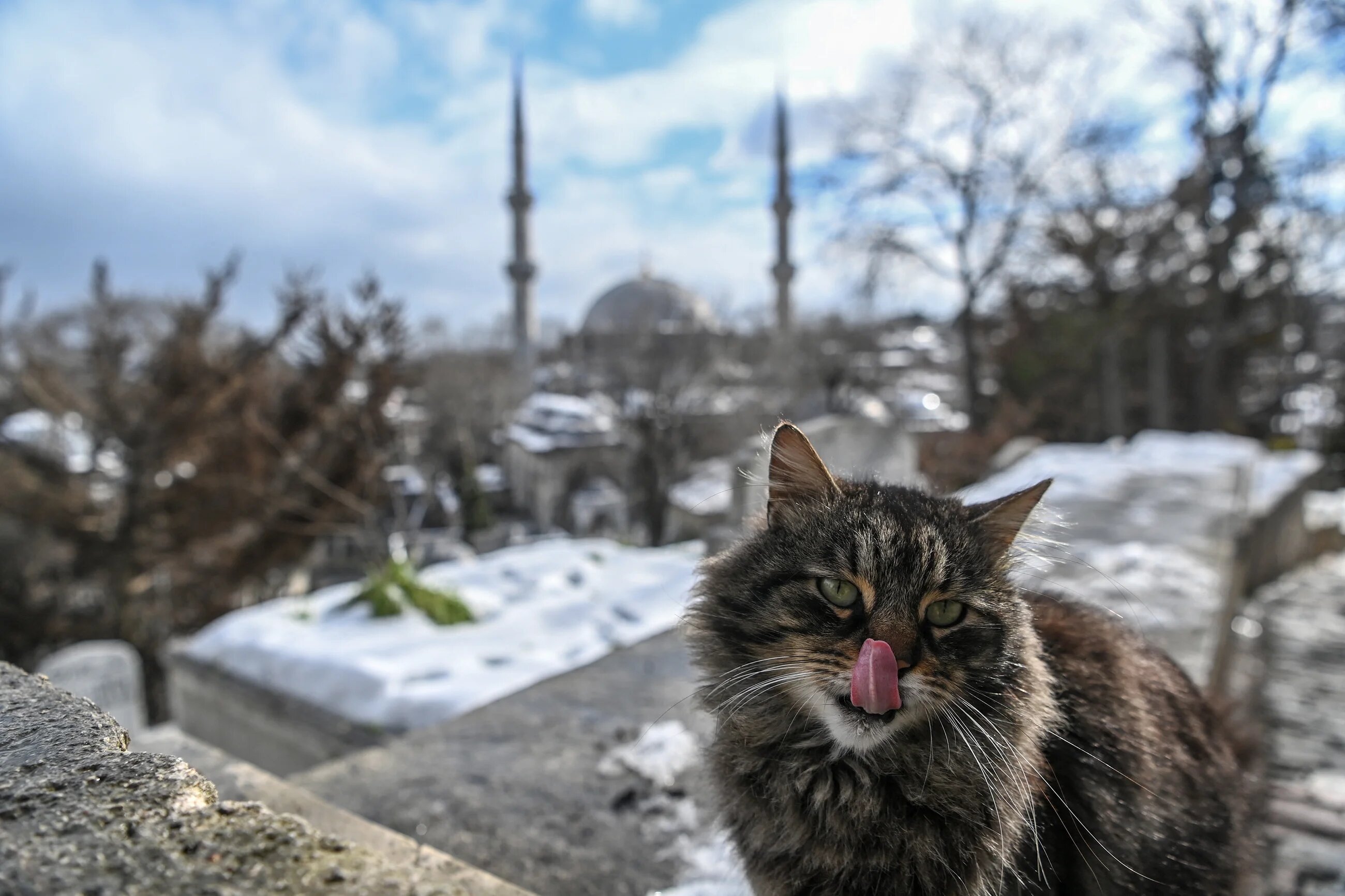 A cat is pictured in the historical cemetery at the Eyup Sultan district of Turkey's Istanbul, following a flurry of snow. (AFP/Ozan Kose)