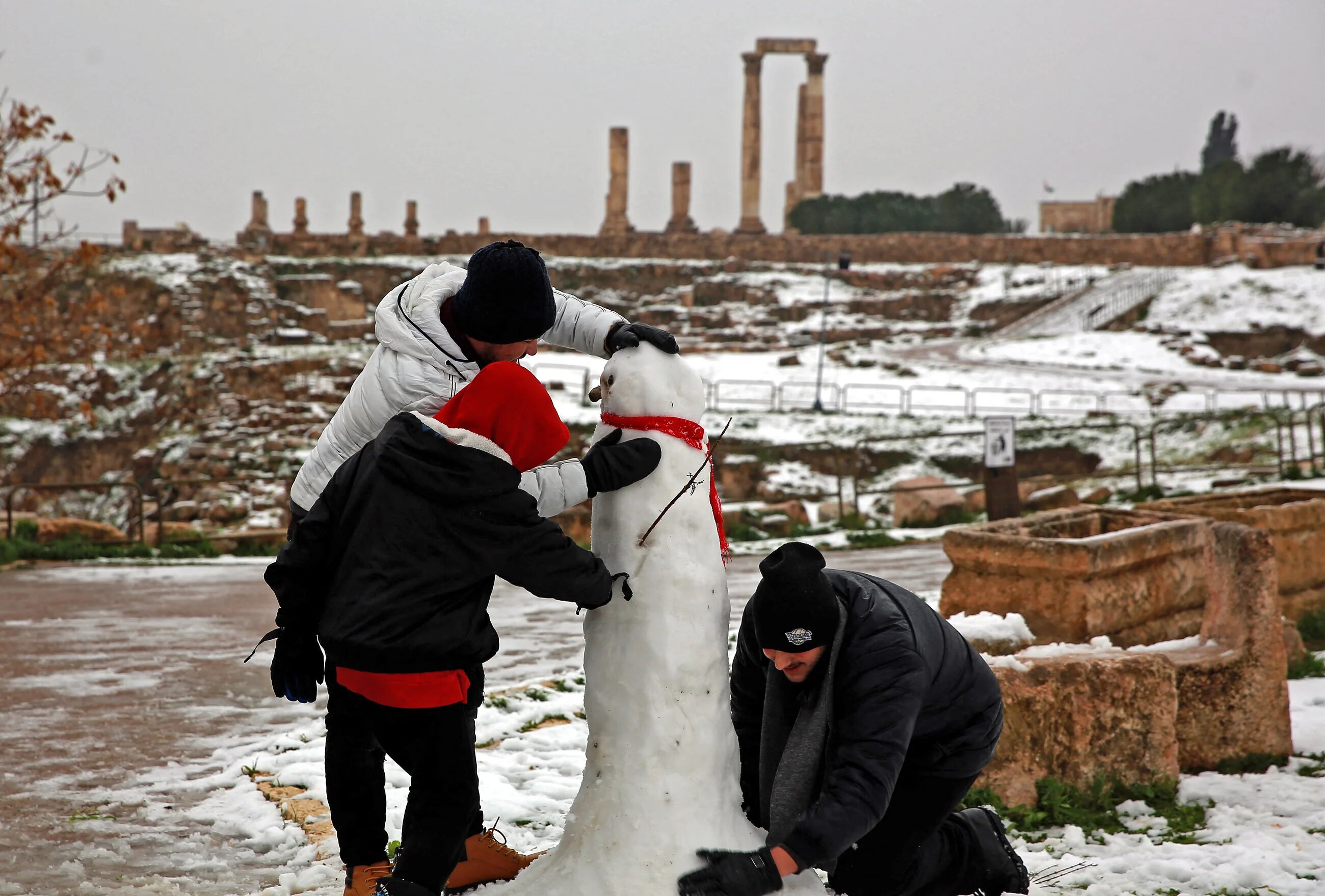 The historic ruins of Amman’s citadel in Jordan provided the perfect backdrop for young children to go out and make a snowman. (AFP/Khalil Mazraawi)