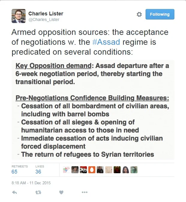 According to Lister, the armed opposition have set out several preconditions for meeting Assad representatives, including an immediate end to bombardments targeting civilian areas ahead of a six-week negotiation period leading to Assad’s departure.