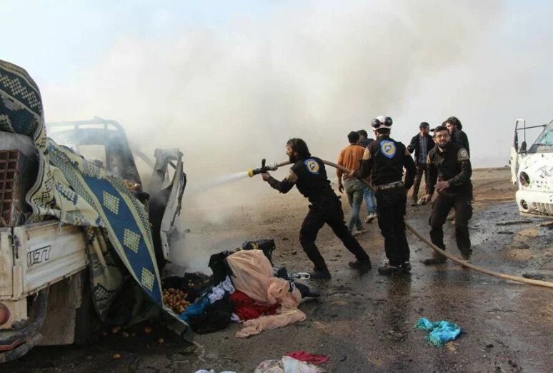 Images posted by the Syrian Civil Defence Force (SCD), also known as the White Helmets, showed rescue volunteers helping refugees who were part of a convoy that was struck by the Syrian government in the village of Telahdiya in the West Aleppo countryside.