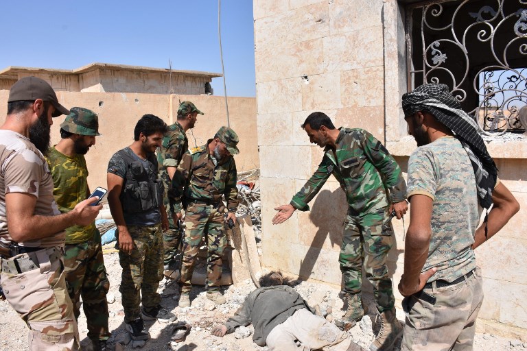 Syrian pro-government members stand next to a body in the Jamiyet al-Ruwad neighbourhood, on the northern outskirts of Deir Ezzor (AFP)