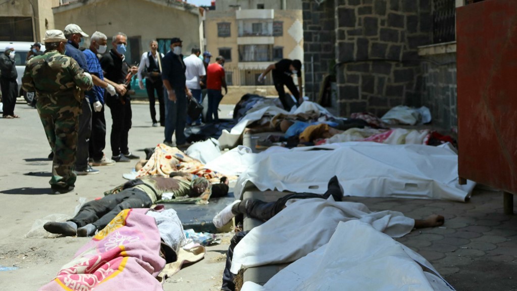 The bodies of victims of the recent clashes between local Druze fighters and Bedouin tribes, are laid out for identification in the yard of a hospital in Syria's southern city of Sweida on 17 July 2025 (Shadi al-Dubaisi / AFP)