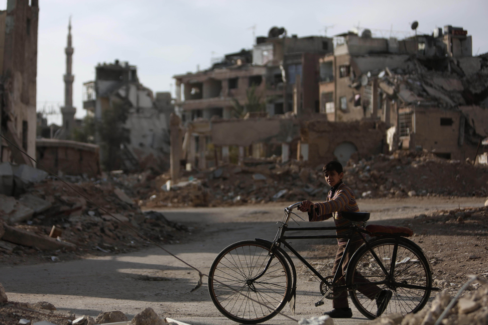 A child pushes his bike across the city, Eastern Ghouta (Amer Al Shami/Save the Children)