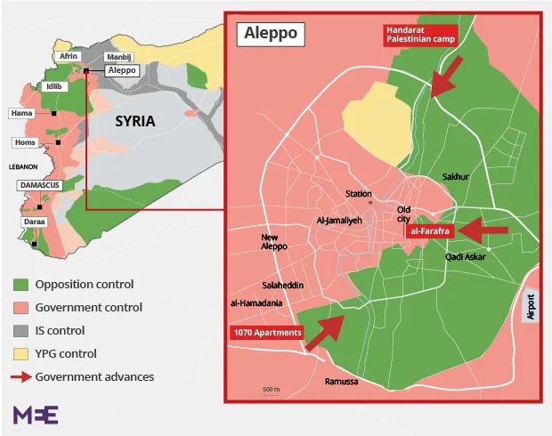 The Syrian army also advanced around the 1070 Apartments and al-Hamadania districts, in the southwest of the city.