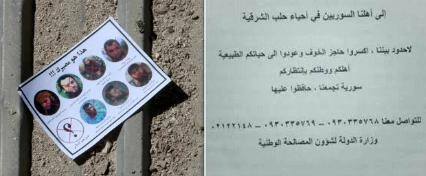 The first leaflet warns rebel fighters that they will be next, and shows the portraits of rebel leaders recently killed in clashes, struck through with red crosses.