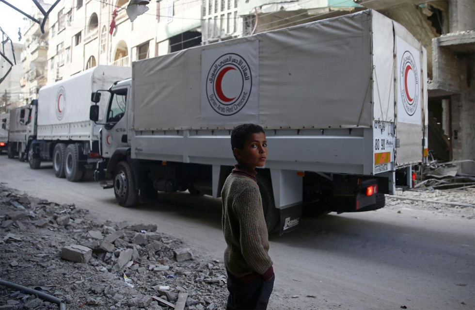The Red Crescent said the aid convoy of 13 vehicles passed through front lines and was heading to the enclave's biggest town, Douma. The bombing soon resumed.