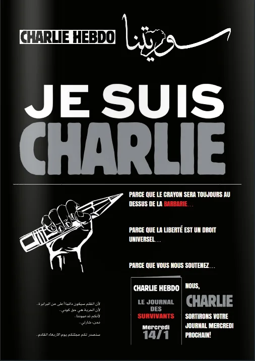 The 173rd issue of the paper, which features a “Je Suis Charlie” strip on the front cover, contains inside reprintings of Charlie Hebdo cartoons mocking Syrian President Bashar al-Assad, obituaries of the journalists killed and messages of solidarity.