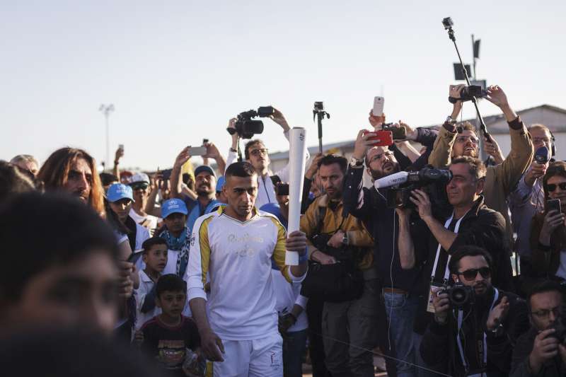 Ibrahim al-Hussein, a 27-year-old refugee who used to competitively swim in Syria, ran the torch through Eleonas camp.