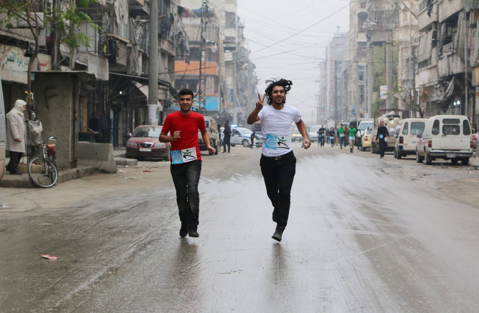 In a video posted by the Aleppo Media Centre, children cheer as the runners – young men and women in bright green shirts – sprint down a rubble-strewn street past flattened cars and bombed-out houses in the Bustan al-Qasr neighbourhood.