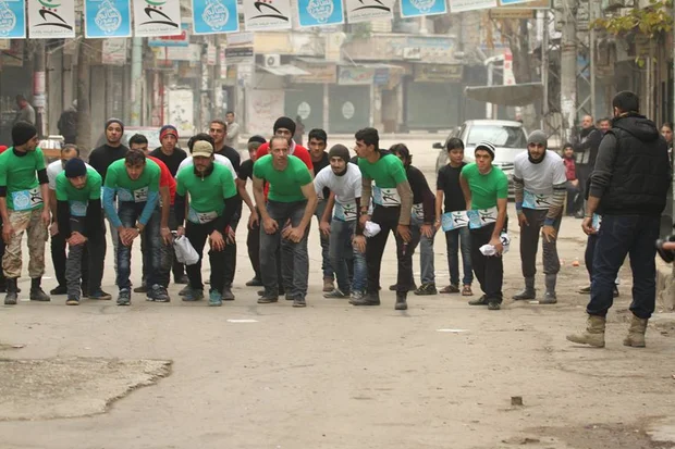 At least 60 runners took part in a race in a rebel-held neighbourhood of Aleppo on Tuesday in honour of the victims of a group execution whose bodies were reportedly discovered in the city’s Queiq River in January 2013.