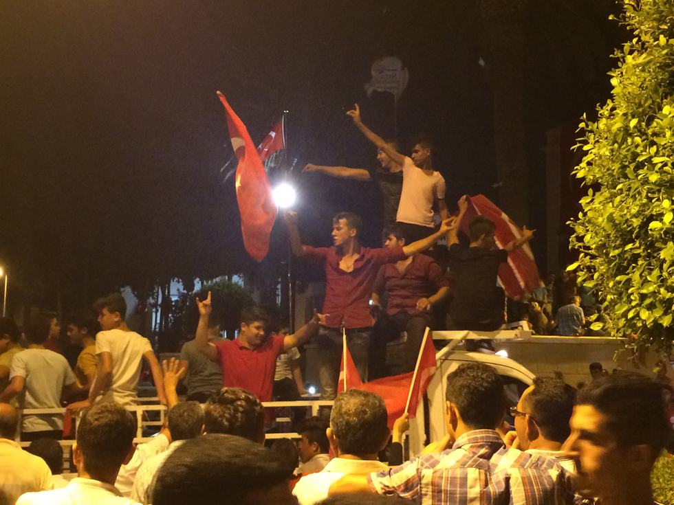 Local politicians in Antakya used the military's absence to turn the post-coup period into a political rally, and jubilant city residents rode trucks, tractors and cars through the city centre (MEE/Lizzie Porter)