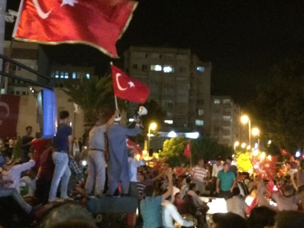 Whereas in Istanbul and Ankara pro-government protestors were faced with tanks, and warplanes flew overhead, the atmosphere in Antakya was more jubilant, with children sporting red and white T-shirts and tractors joining the tooting motorbikes and vans.