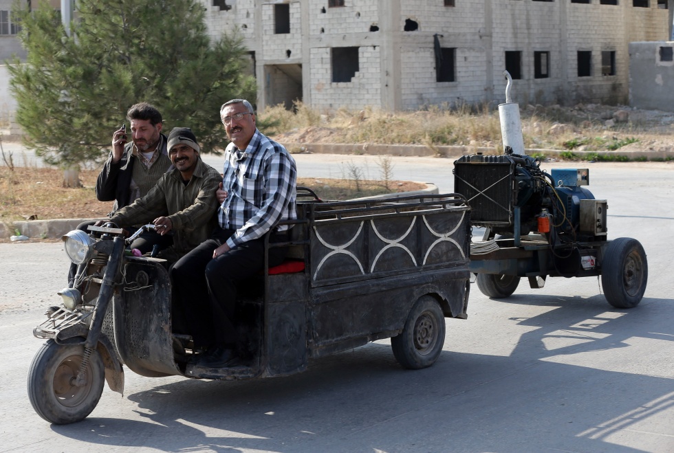 Syrian men tow a generator in Aleppo's industrial area in the government controlled side of the war-torn northern Syrian city on 18 November, 2014 (AFP)