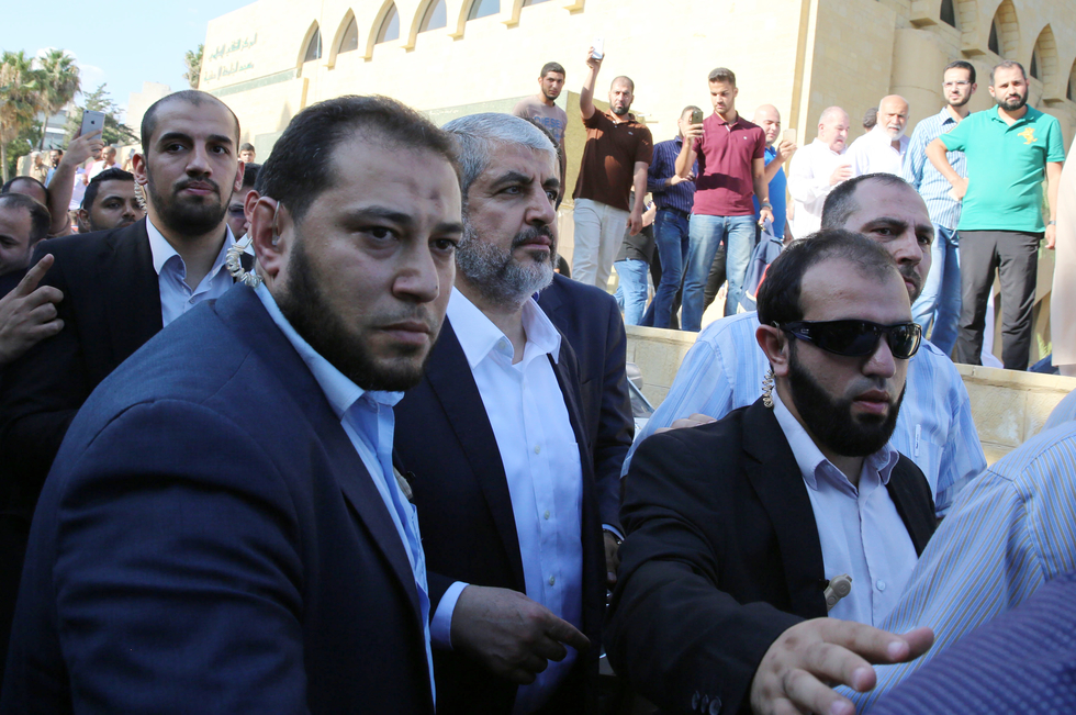 Hamas leader Khaled Meshaal flanked by bodyguards in Jordan earlier this month (AFP)