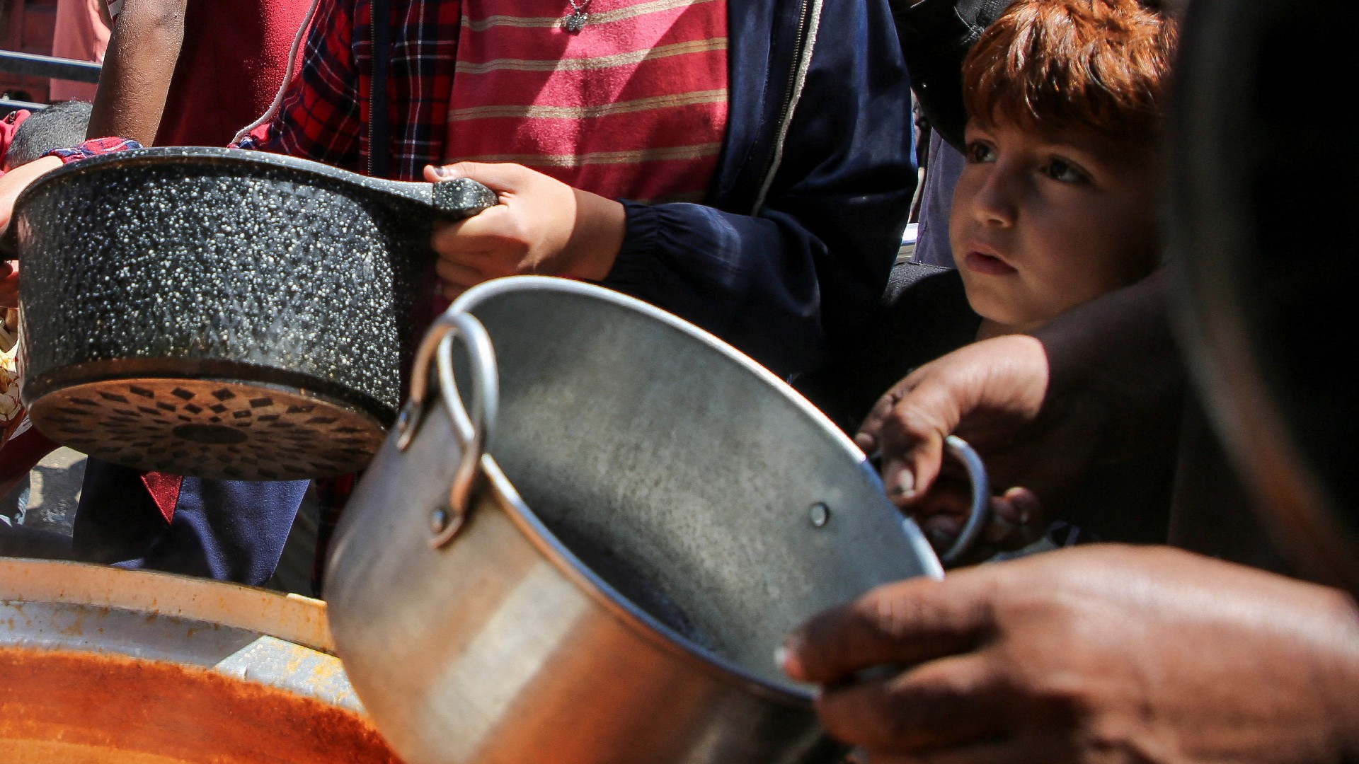 Palestinians gather to receive food cooked by a charity after an Israeli assault on Rafah, 8 May 2024 (Reuters)