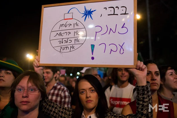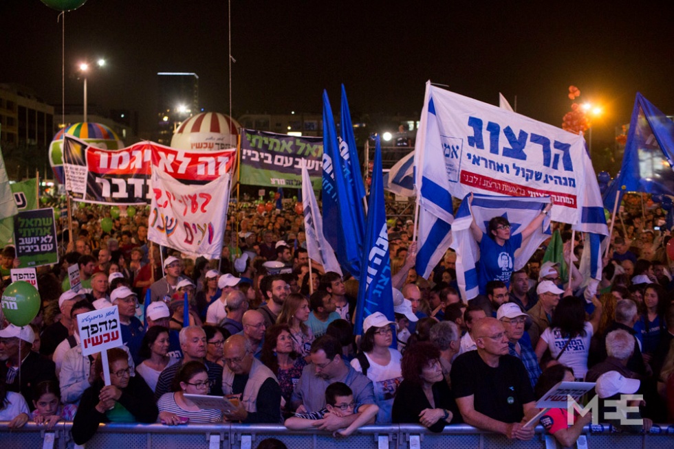 The protest, organised by the V15 movement, a grassroots movement that stands for Victory 2015, was the largest demonstration so far during this year’s elections – and the first time since Netanyahu came to power in 2009 that Israeli voters in such large numbers have demanded a new government.