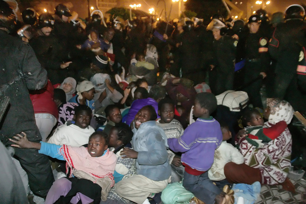 Egyptian riot police surround and attack Sudanese women and children during a forceful evacuation of thousands of Sudanese refugees outside the UN offices in Cairo on 30 December, 2005 (AFP)