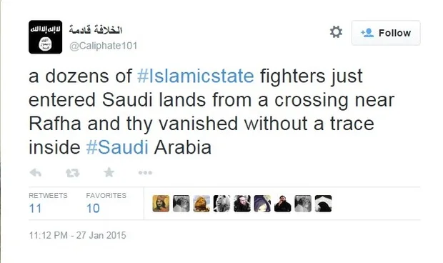 Translation: The Interior Ministry has revealed information about the entry of tens of IS fighters through a post near Rafha – they succeeded in disappearing within Saudi Arabia. It has not been possible to catch up with them yet.