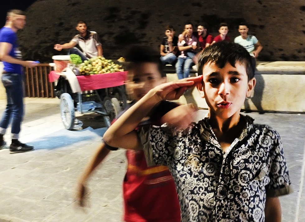 Off-duty soldiers and only sons, to whom Syria’s ongoing compulsory military conscription does not apply, lark around, trying to make eye contact with girls in high-heels.