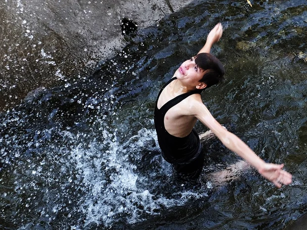 A boy cools off in a shallow park river (MEE/Katharine Cooper)