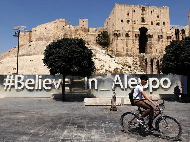 Below, the pavement bustles with families who pause for selfies in front of a large metallic #Believe in Aleppo sign, or sip tea and smoke shisha pipes at overpriced cafes.