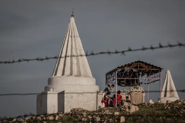Children play at a Yazidi temple in June 2016, near Khanke camp in Dohuk, Iraq (MEE/Sebastian Castelier)