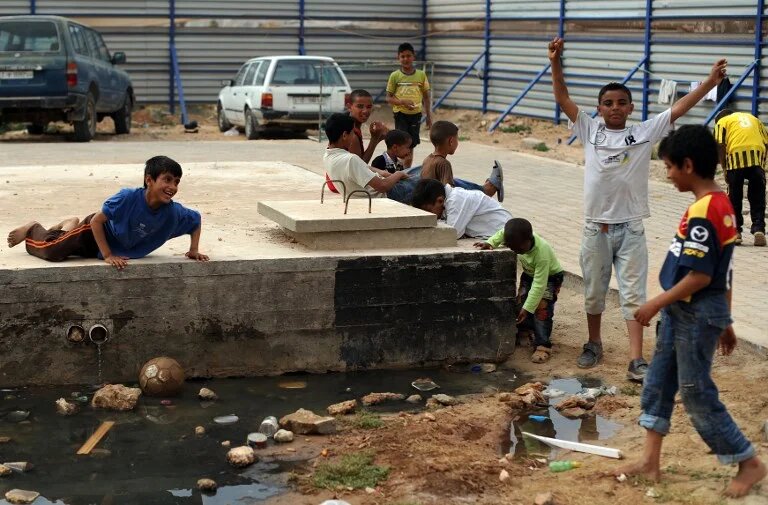 Internally displaced Libyan children play inside a compound of a refugee camp east of Benghazi (AFP)