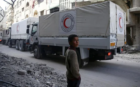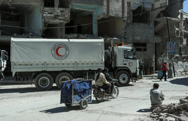 Syrian Red Crescent trucks carry deliveries of aid into Douma (AFP)