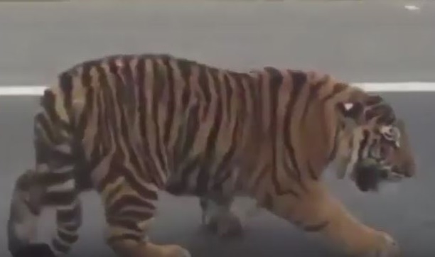 The tiger was recorded a by someone sitting in a vehicle. It appeared to be a pet on the loose as it had a chain around its neck.