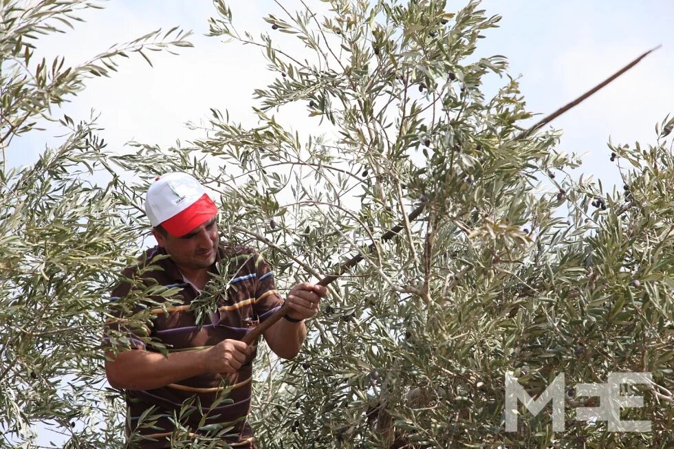 A farmer uses a stick to knock fruit from the trees whilst others pick each olive by hand (MEE/Rich Wiles)