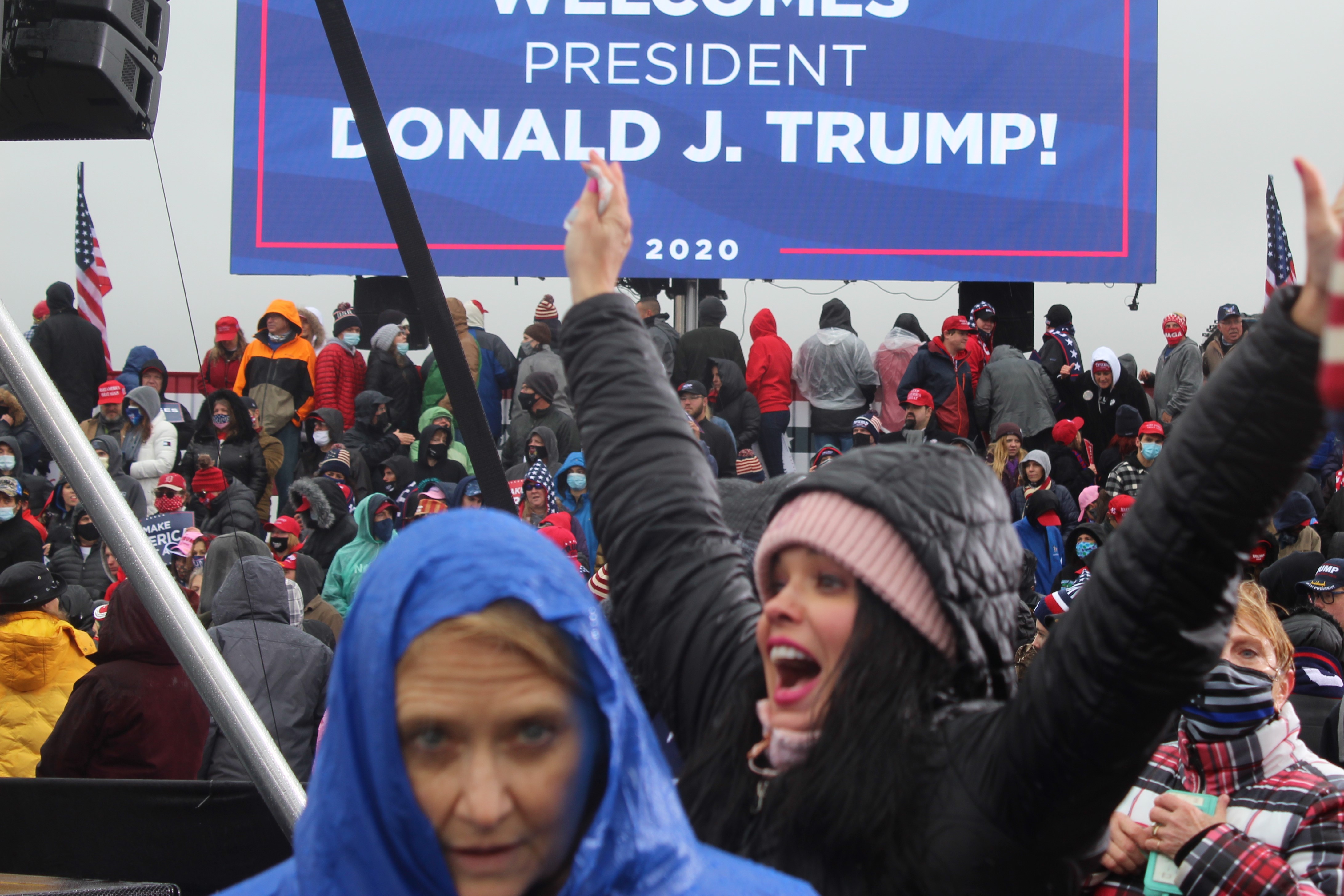 After supporters waited for hours in the miserable weather, Trump arrived on Air Force One, the presidential jet, descending on the tarmac metres away from the rally.