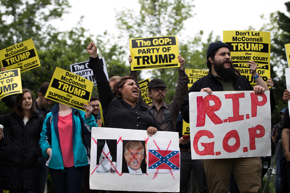 Protesters rally outside National Republican Senatorial Committee office, where Republican presidential candidate Donald Trump met Senate GOP leadership in Washington, DC (AFP)