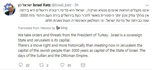 But Israel Katz, minister of intelligence and transport, took to Twitter to reject Turkey's threat and reiterate Israel's position on the city.