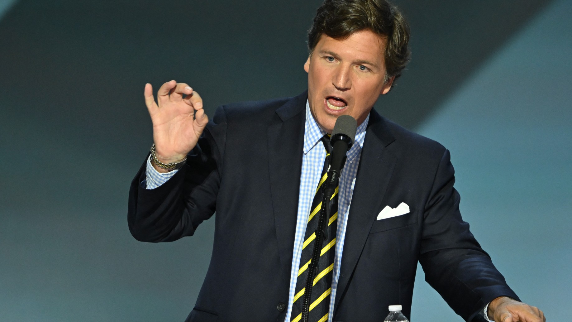 US political commentator Tucker Carlson speaks during the last day of the 2024 Republican National Convention at the Fiserv Forum in Milwaukee, Wisconsin, on 18 July 2024 (Andrew Caballero-Reynolds/AFP)