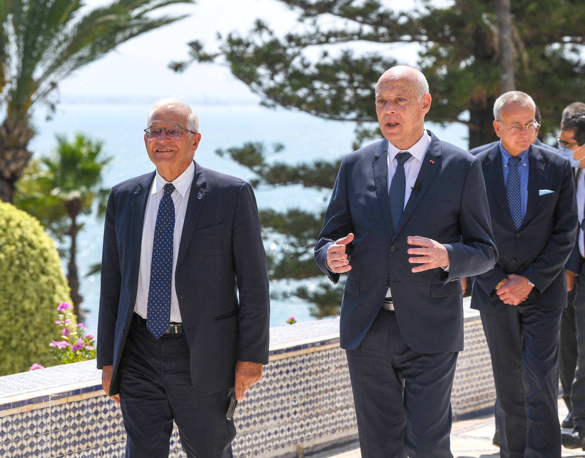 Tunisia's President Kais Saied (right) walks with European Union foreign policy chief Josep Borrell (left) in Tunis on 10 September 2021 (Tunisian Presidency/Handout via REUTERS)
