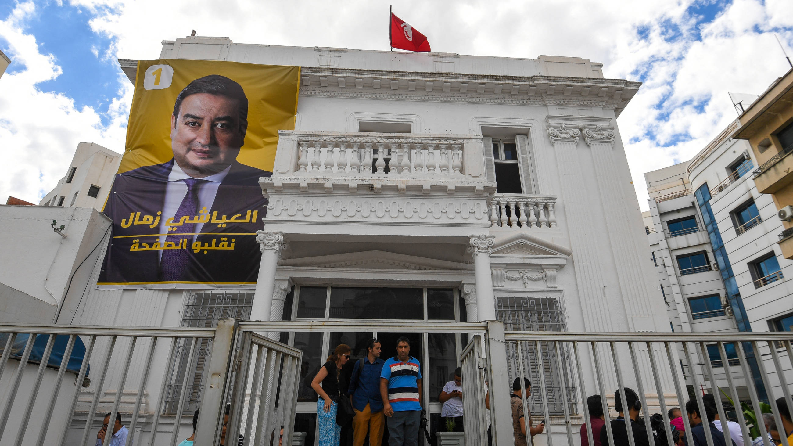 A poster of imprisoned presidential candidate Ayachi Zammel is displayed at the entrance of his electoral headquarters in Tunis on 16 September 20204 (Fethi Belaid/AFP)