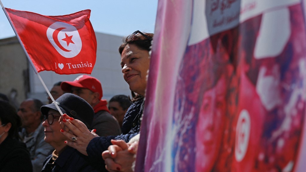 Tunisian protesters at a rally against President Kais Saied's power grab in the capital of Tunis, 13 March 2022. (Afp)