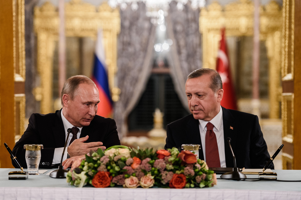 In his speech to the World Energy Congress before their bilateral talks, Erdogan complained how a child in Aleppo "only sees bombs dropped by helicopters and planes that target them" but made no mention of Russia or the Assad regime.