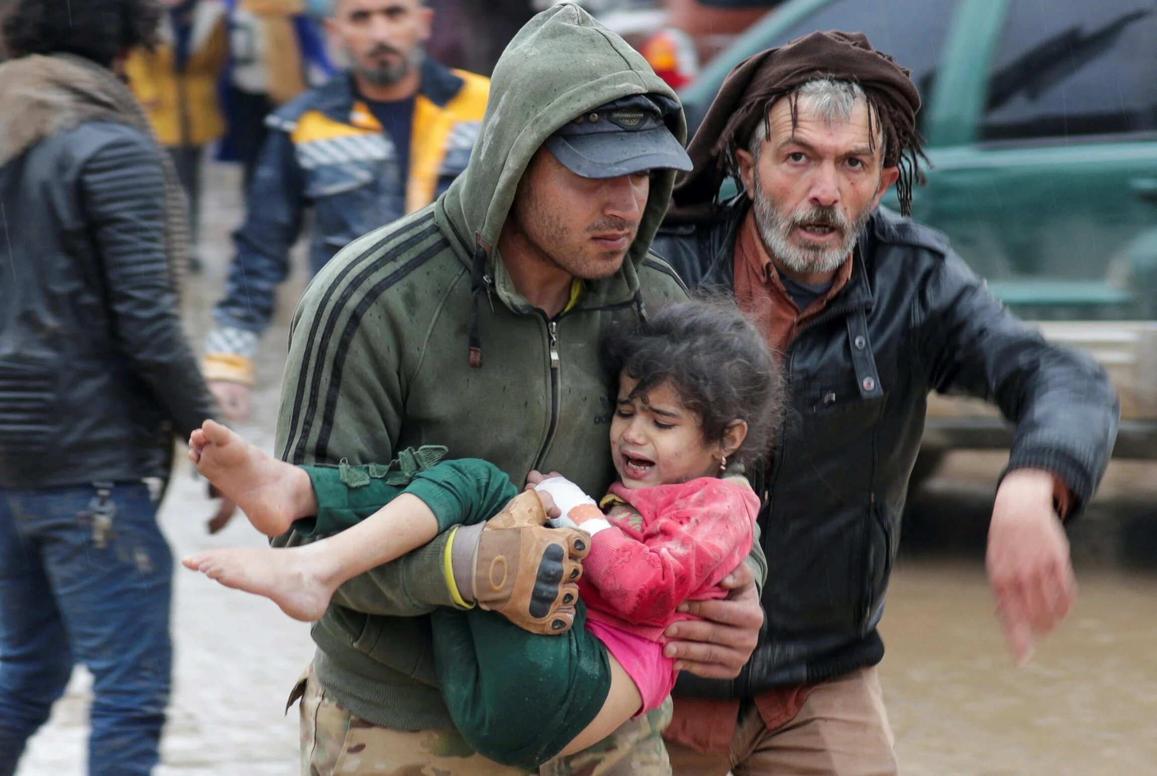 A man carries a girl following the earthquake, in the rebel-held town of Jandaris, Syria, on 6 February 2023 (Reuters)