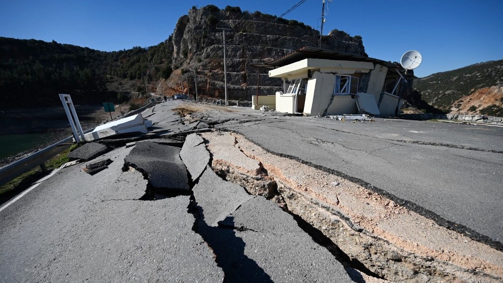 A picture taken on 16 February shows cracks on a road near the quake’s epicentre, in the city of Kahramanmaras, after the earthquake which struck parts of Turkey and Syria (AFP)