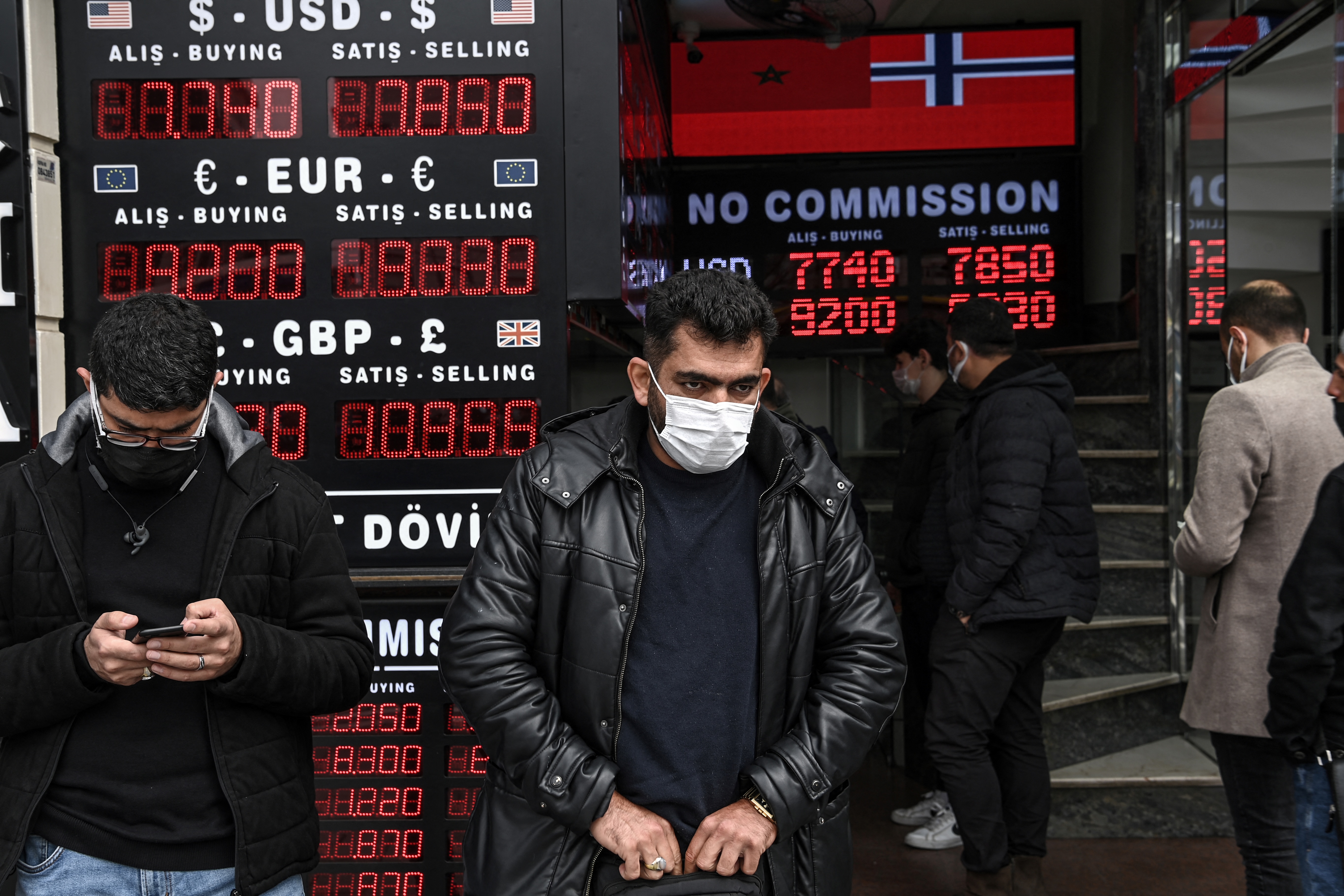 Customers wait in front of a currency exchange agency as a screen shows foreign exchange rates near the Grand Bazaar in Istanbul on 22 March 2021 (AFP)