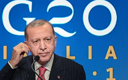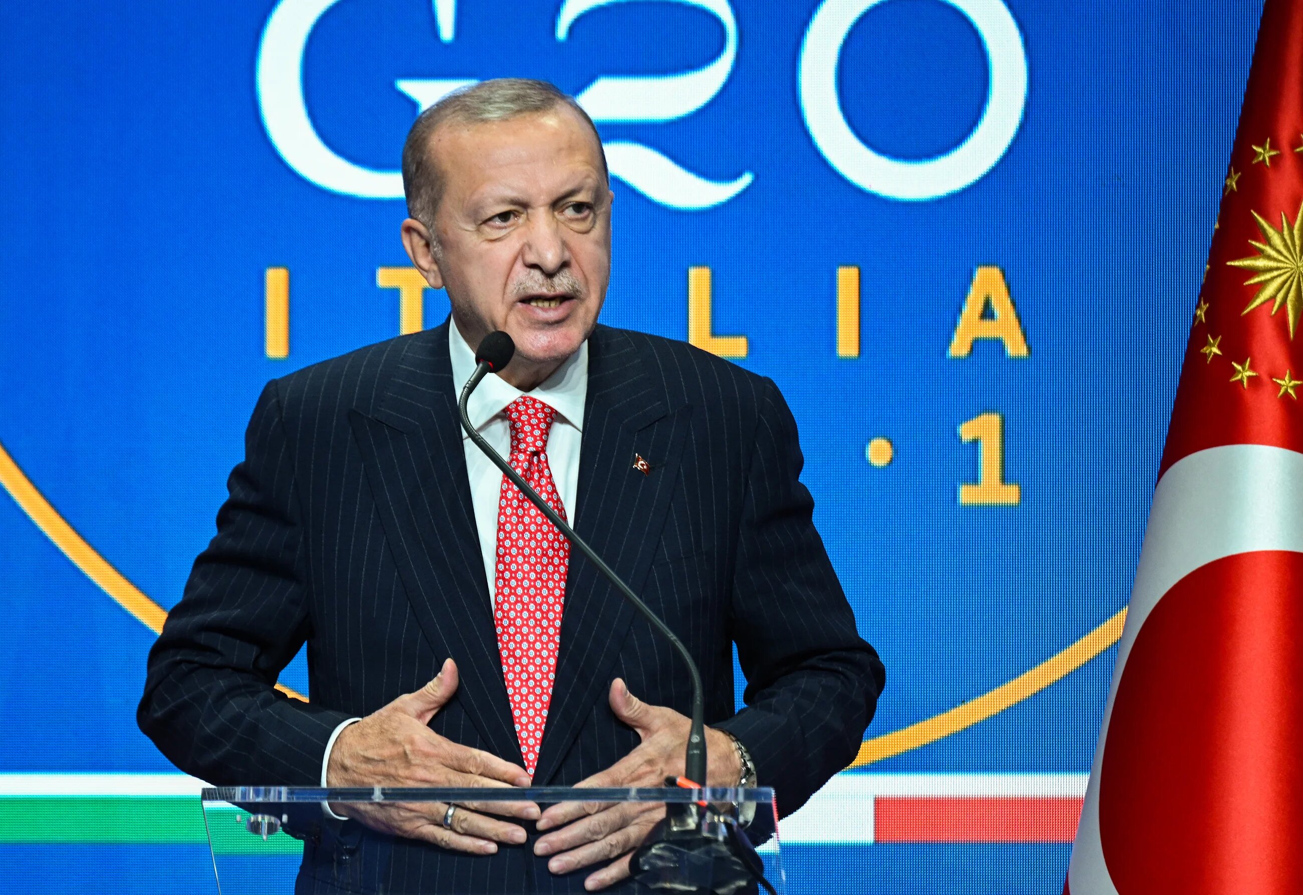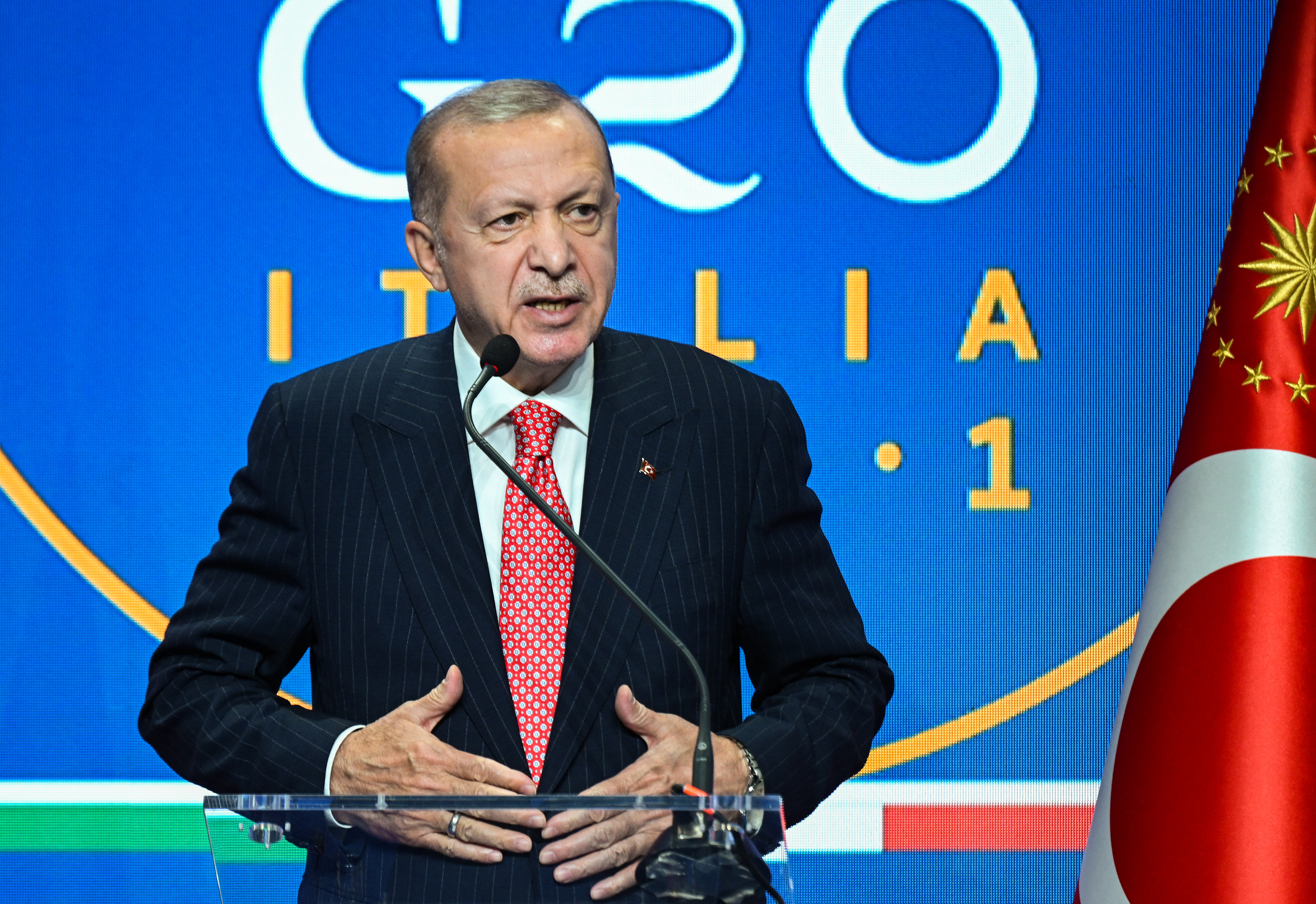Turkish President Recep Tayyip Erdogan addresses a press conference at the end of the G20 of World Leaders Summit on 31 October 2021 in Rome, Italy (AFP)
