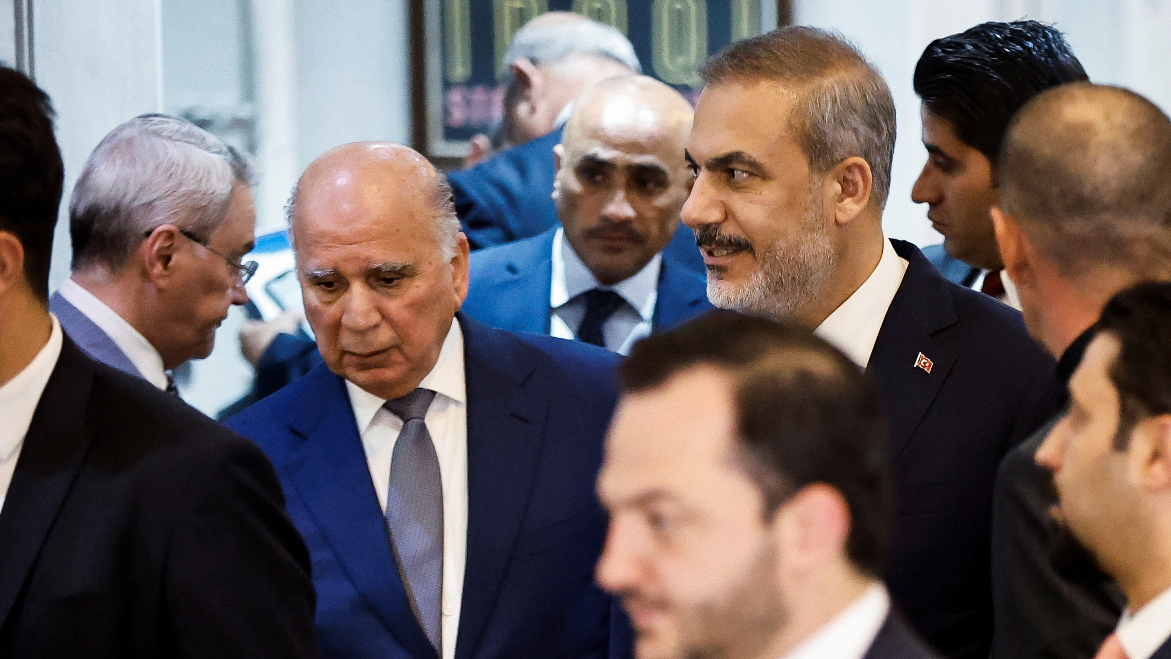 Turkey's Foreign Minister Hakan Fidan (R) and Iraq's Foreign Minister Fuad Hussein (L) leave after a meeting in Baghdad on 22 August 2023 (Reuters)