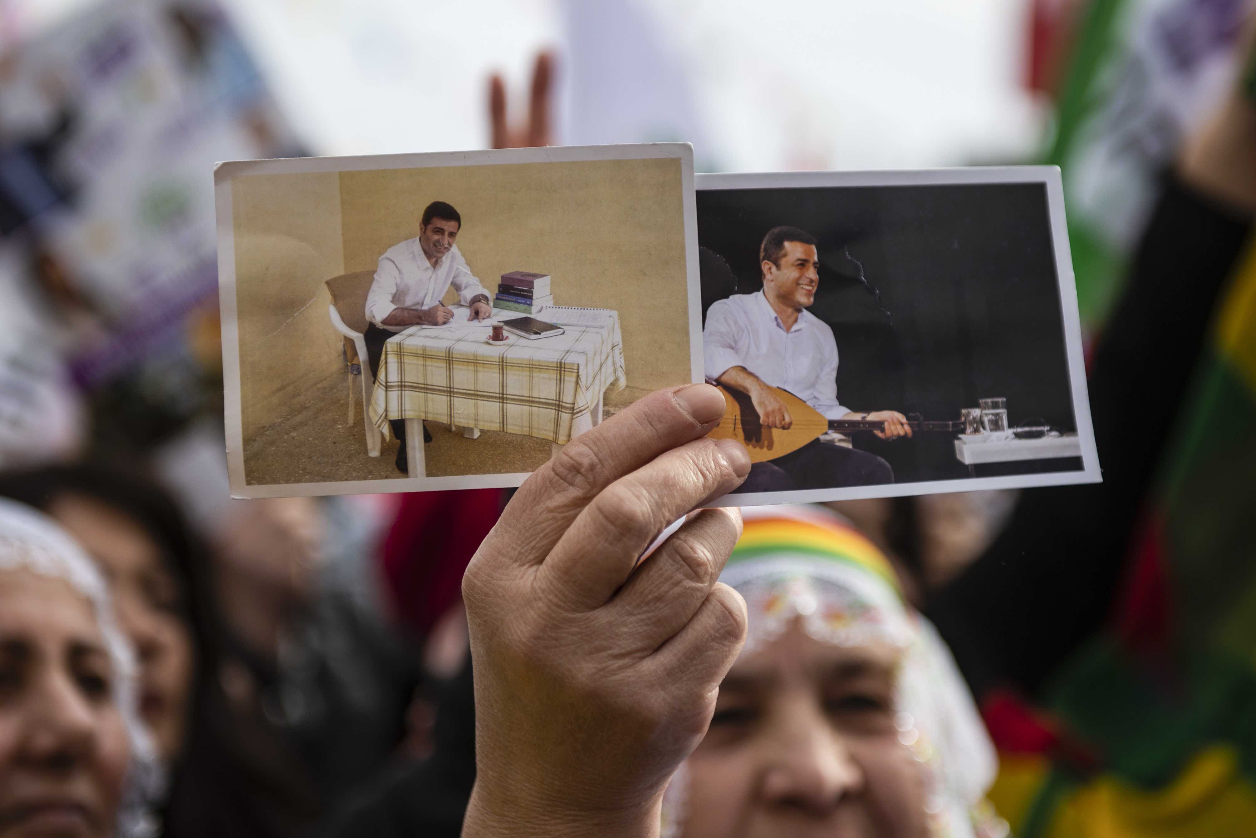 Supporter of the pro-Kurdish Peoples' Democratic Party (HDP) holds pictures of jailed former party leader Selahattin Demirtas during a rally in Istanbul on 3 February 2019 (AFP)